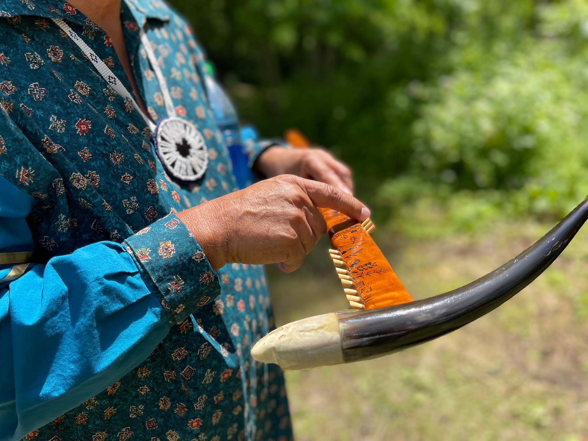Image: Ken Maracle (Deer Clan, Lower Cayuga Longhouse, Six Nations of the Grand River) with a traditional Condolence Cane. Taken at Johnson Hall Historic Site, June 2022 by Charles Prior.
