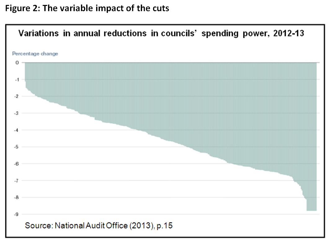 Up till now local government has taken more than its fair share of the downward adjustments to spending plans. Funding for councils has fallen by an average 21% and ‘councils serving deprived areas have seen the largest reductions in funding relative to spending since 2010/11’.