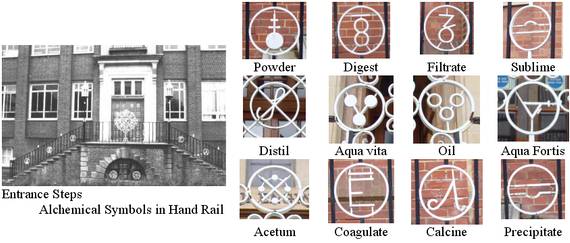 At the head of the NE staircase there is an ornamental screen of standard plant flowsheeting symbols and at the head of the SW staircase a screen of chemical engineering diagrams. Garners’ interests in ‘drops’ is recorded by the various drop shapes engraved in the windows of the main staircases. Alchemical symbols are to be found in the hand rail of the entrance steps [and on the floor of the 1926 building].